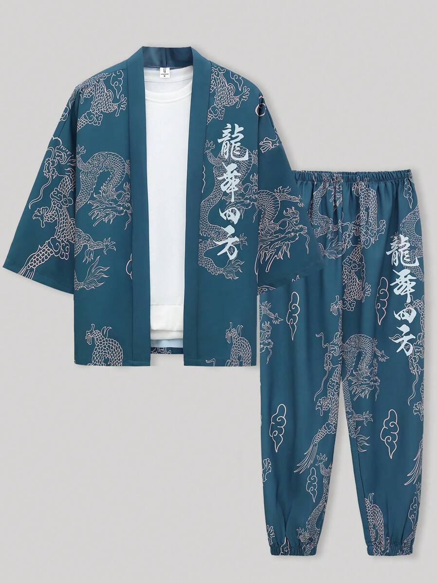 Men's Chinese Style Dragon Print Robe And Pants Pajamas Set
