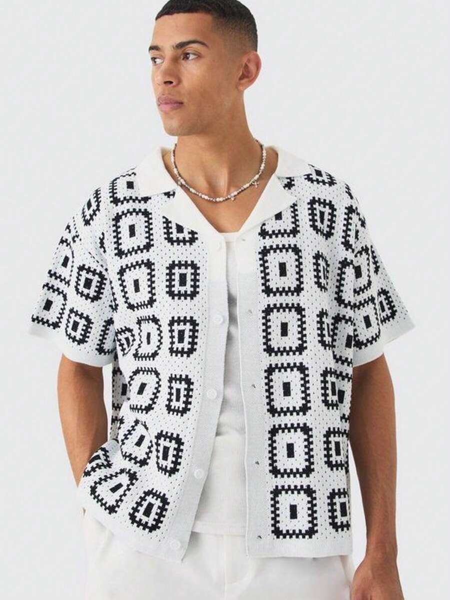 Men's Geometric Pattern Short Sleeve Single-Breasted Casual Knit Cardigan