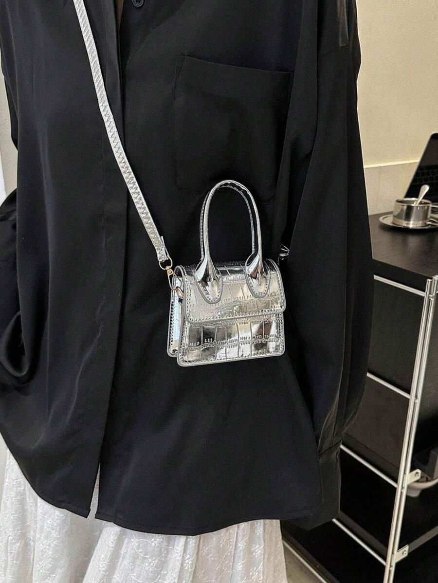 Mini Square Bag Crocodile Embossed Silver Funky, Animal Print Women Bag