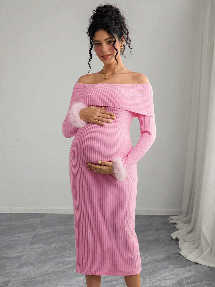 Momance Maternity Long Sleeve Fuzzy Off Shoulder Bodycon Dress