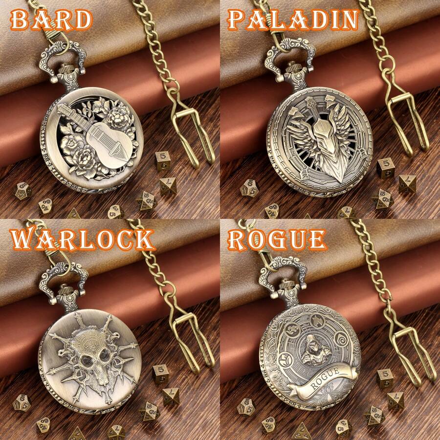 1pc Bronze/Deep Silver/Ancient Gold Vintage Carved Lyre, Poet-Bard, Rogue-RG, Fighter-Paladin, Warlock, Retro Pocket Watch Case + Chunky Chain, Mini Dice Set Including 7 Metal Dice For Tabletop Roleplaying Game, Toy Accessory Gift For RPG Dice Game