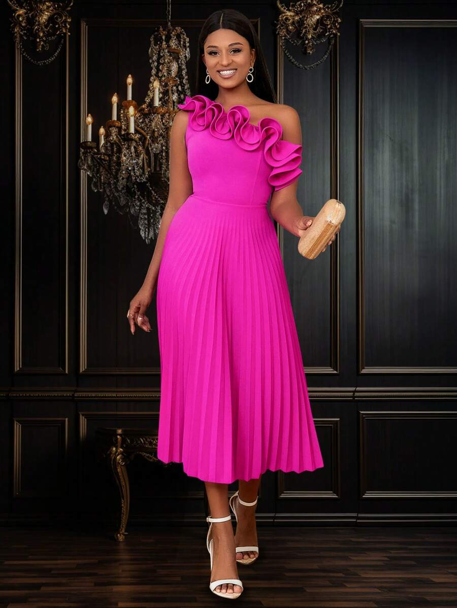 One Shoulder Frill Hem Pleated Dress