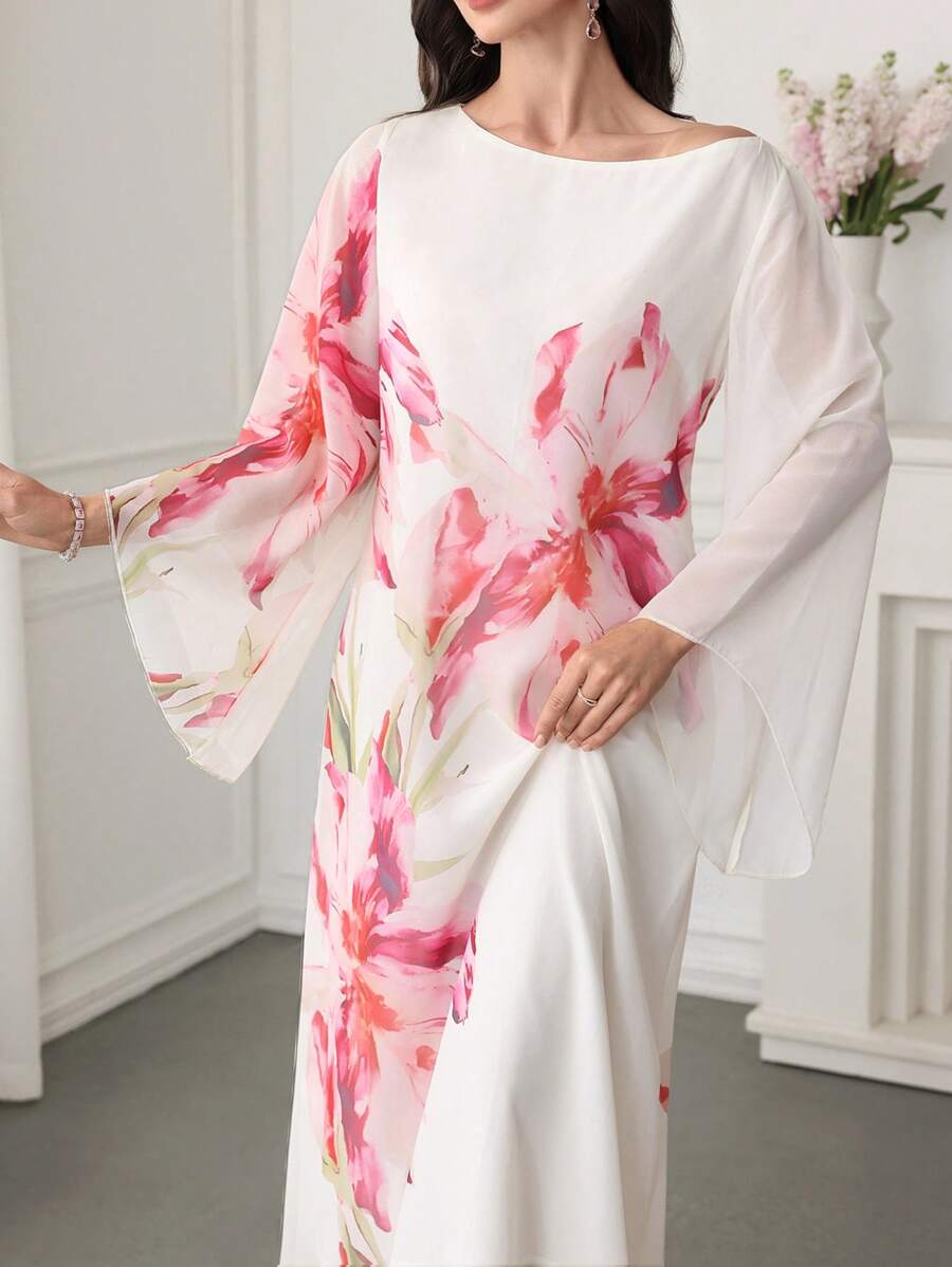 SHEIN Najma Elegant Floral Print Flare Sleeve Dress