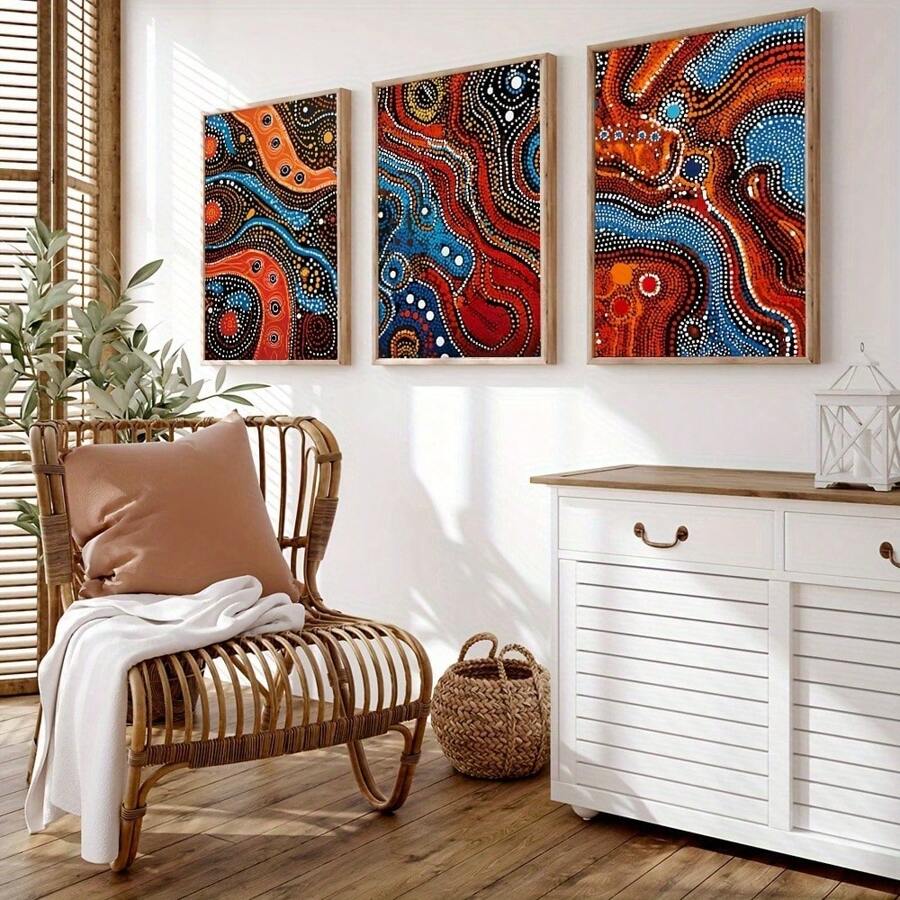 3pcs Set Frameless Vintage Aboriginal Art Canvas Prints, Apricot Color, Indigo Wall Art For Living Room, No Electricity Needed, Modern Indigenous Artwork Decor Gifts Birthday Graduation
