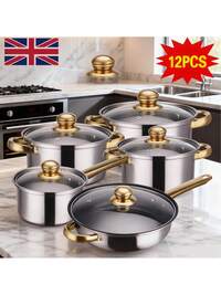 12pcs Premium Stainless Steel Cookware: Saucepan, Casserole & Fry Pan -Included Glass Lids - Suitable For Any Home Kitchen, Garden Picnic, Or Outdoor Camping Adventure
