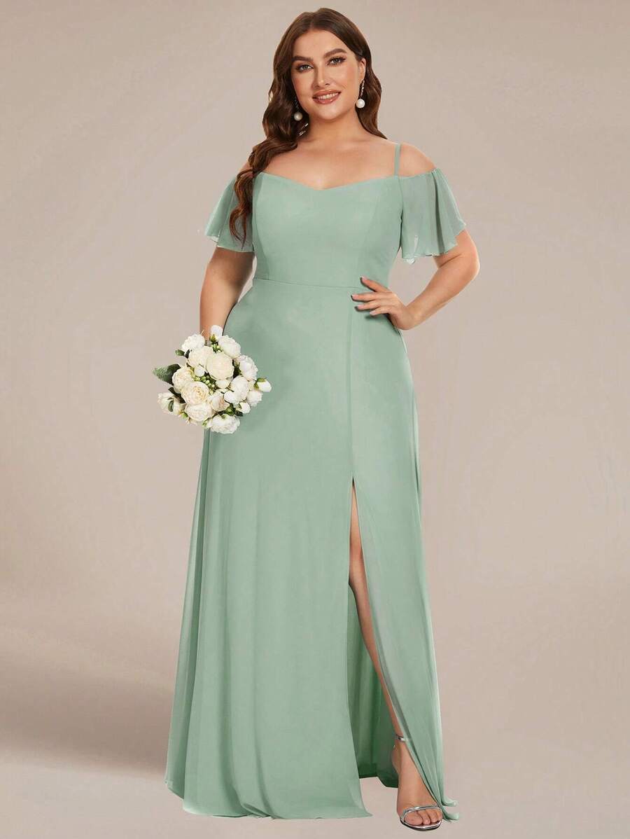 Plus Size Elegant Romantic Alluring Off-Shoulder Sage Green Bridesmaid Dress, Suitable For Autumn Wedding Guest