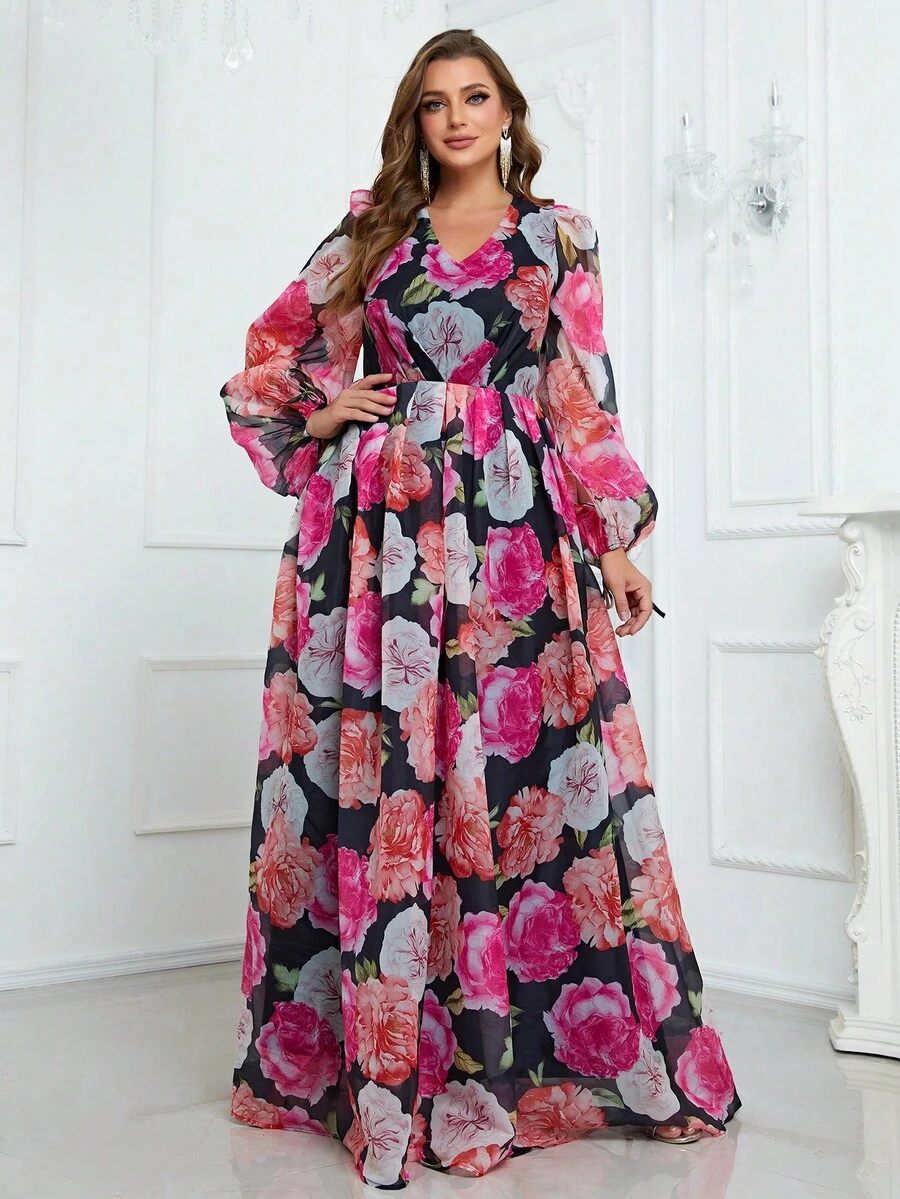 YISIKADO Plus Floral Print Lantern Sleeve Dress