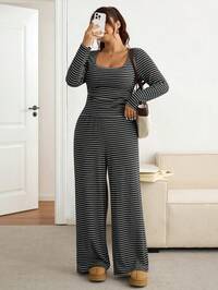 Plus Size Women Casual Sports Street Style Stand Collar Zip-Up Long Sleeve Sweatshirt And Wide Leg Pants 2 Pieces Set, New Arrival In White And Black Color Block Sporty Outfit, Casual Beach Sports Sweatshirt Hoodie For Outdoor, Office, Home, Airport, Spring Autumn, Graduation, Back To School, Teacher Outfit, Loose Fit Long Sleeve Top And Wide Leg Pants #2 Bestseller