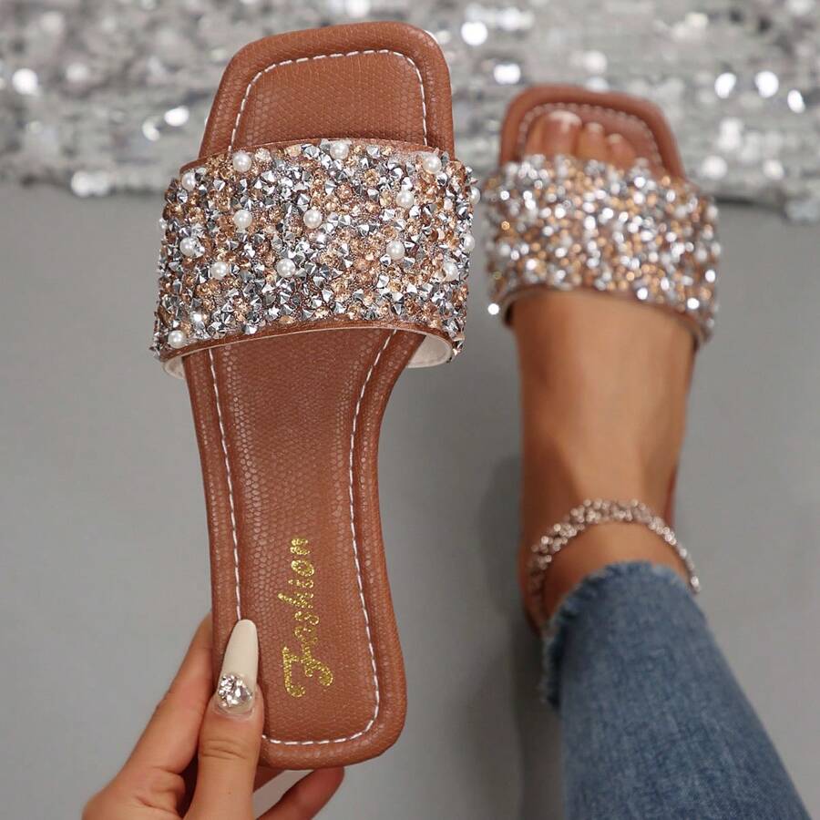 Plus Size Women Flat Sandals Vacation Style Summer Casual Versatile Rhinestone Decor Slide Sandals
