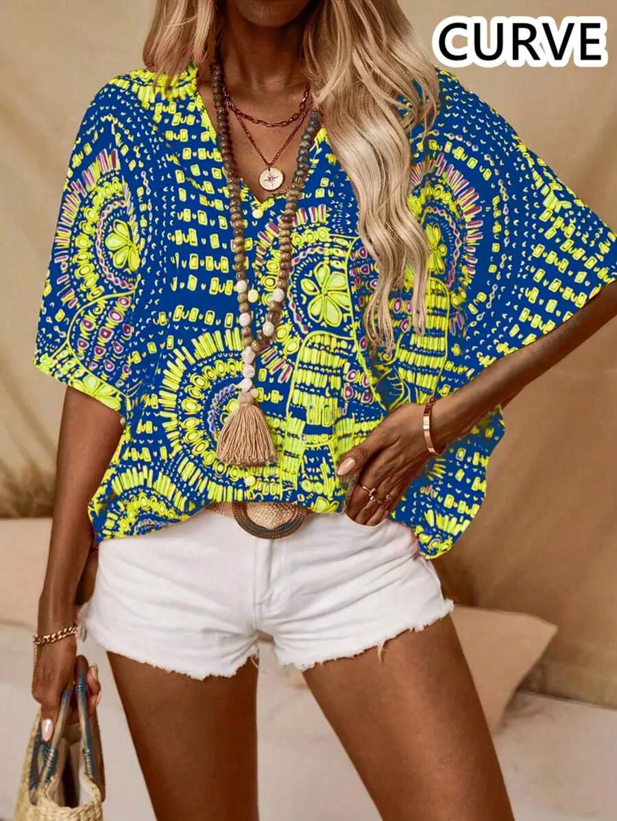 Plus Women's Bat Sleeve Printed V-Neck Blouse