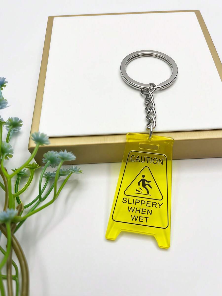 1pc Yellow "Caution Wet Floor" Keychain, Cute Key Chain Accessory, Fashionable & Creative Key Ring, Unisex Keychain For Birthday, Holiday, Daily Use, Travel