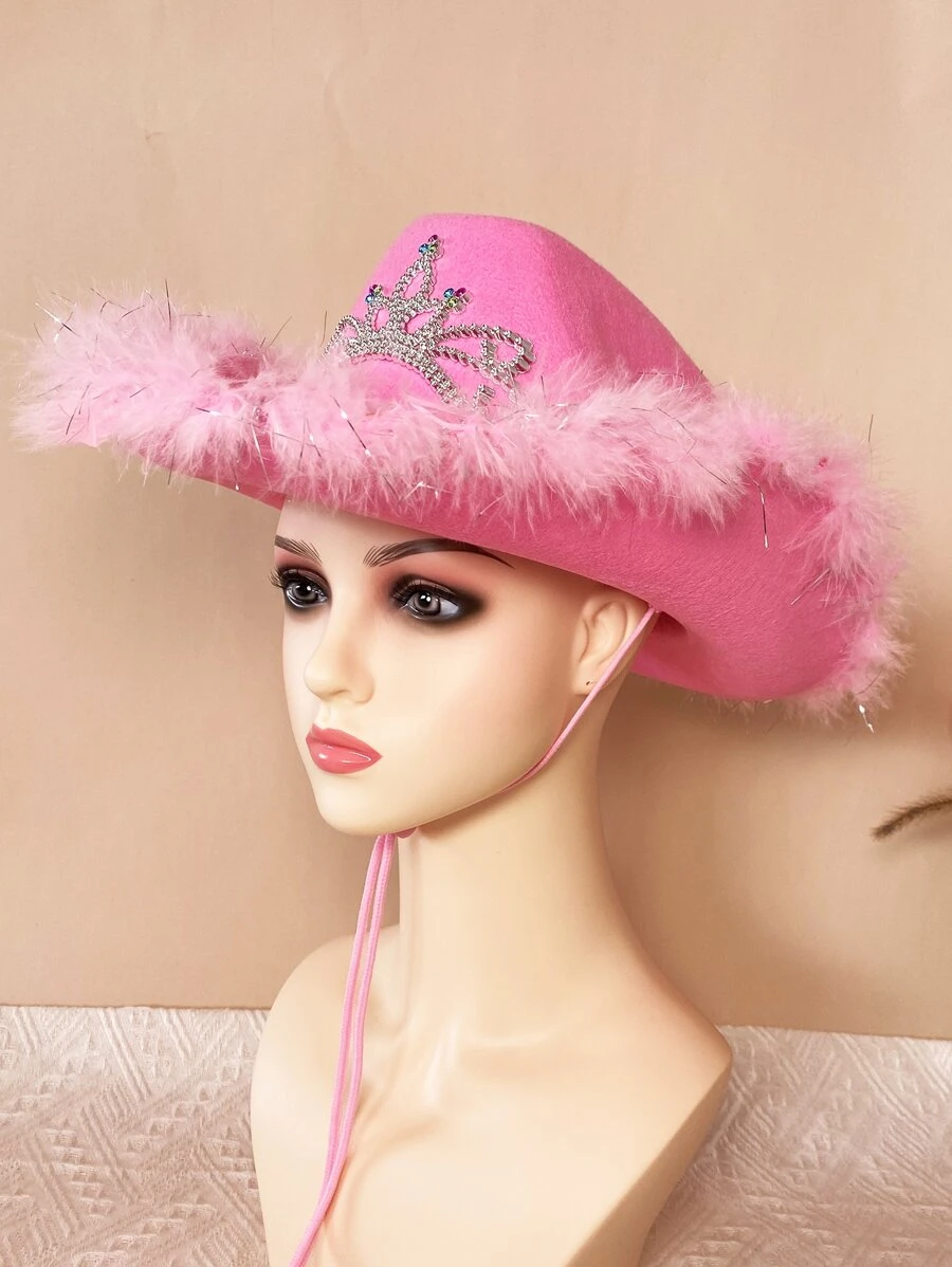 1pc Fashion Women Accessories Rhinestone Crown & Feather Decor Hat Cowboy Hat