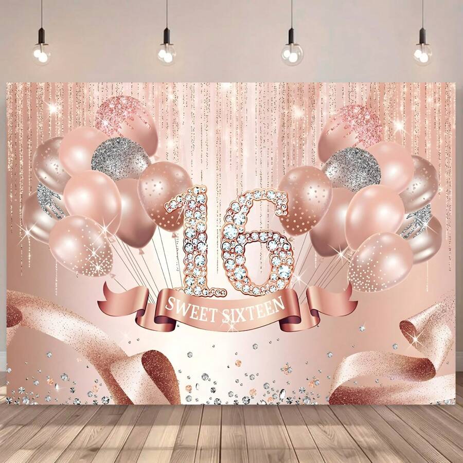 Rose Golden & Shimmering Rhinestone 16th Birthday Party Backdrop Banner For Photo Booth, Cake Table Decor