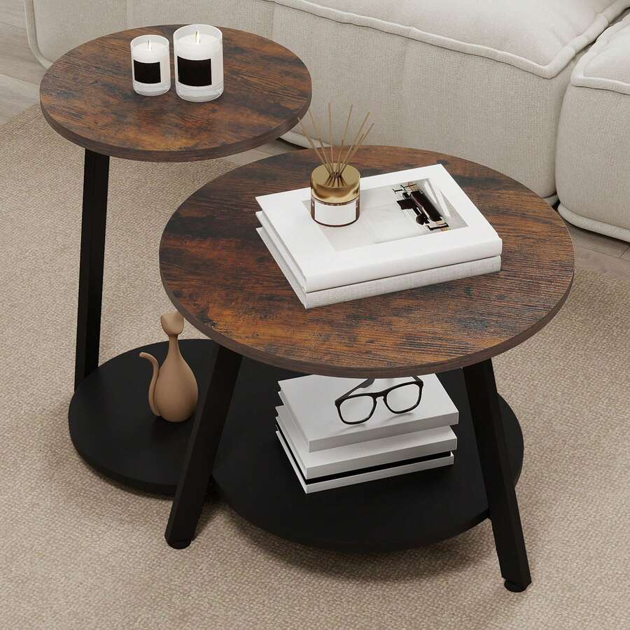 Round Coffee Tables Set Of 2, Nesting Tables With Storage Space And Unified Style Design, Small Coffee Tables, Side Table, Rustic Brown -By GeoTower