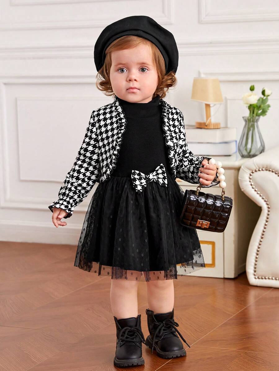 SHEIN Baby Girl Houndstooth Print Jacket & Mesh Overlay Bow Front Dress