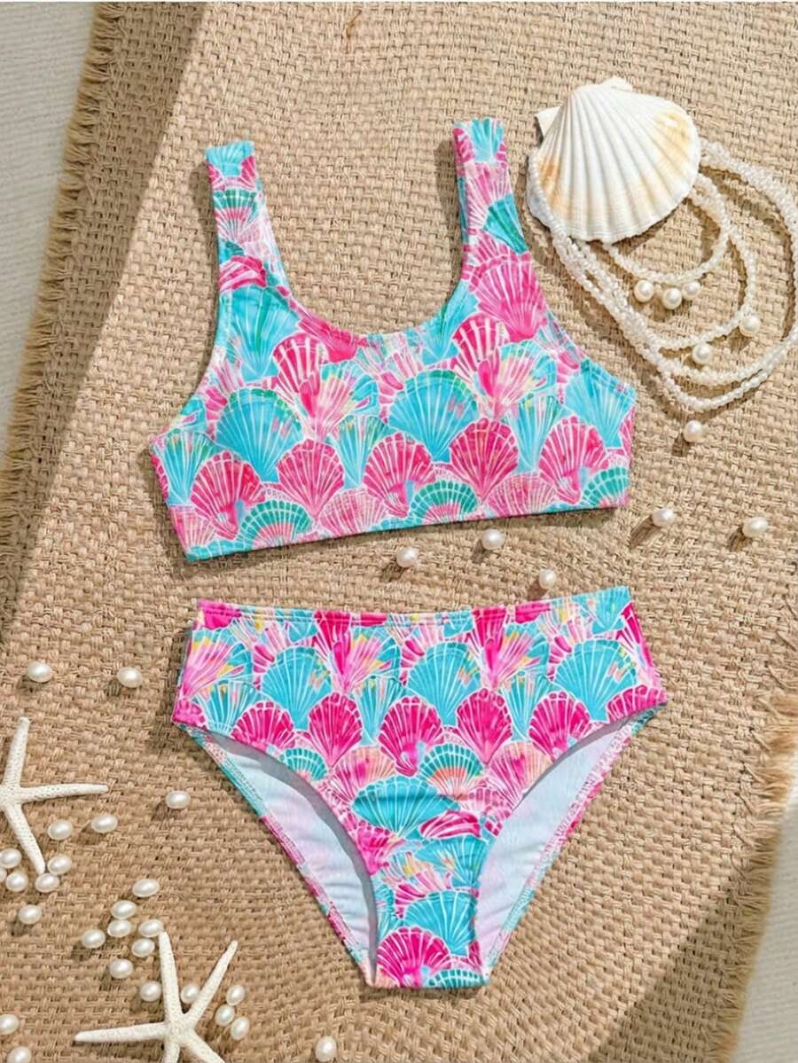 SHEIN Girls' Cute Shell Digital Print Camisole Bikini Set, Suitable For Beach Vacation, Spring/Summer/Autumn Seashell Bathing Suit Girls Printed Swimwear Tween Girls Bikini Tropical Print Bikini Girls Summer Beach 2pcs Tween Girls Printed Swimwear Girls Tropical Print Bikini