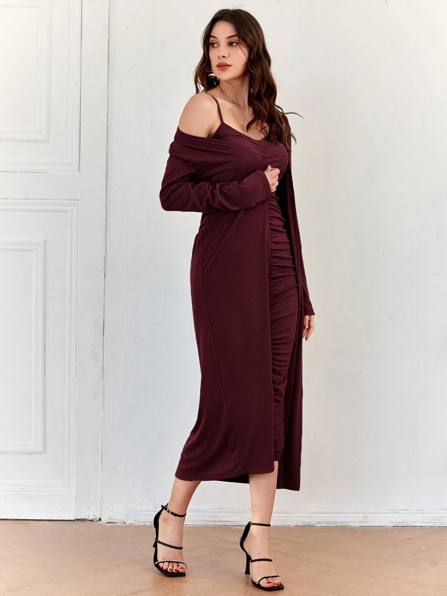Modelyn Open Front Coat & Ruched Bodycon Dress