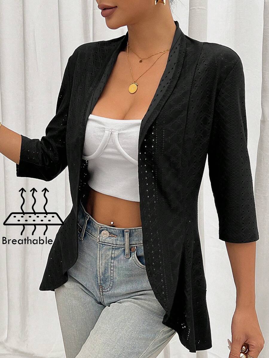 • Firerie Women's Autumn/Winter Basic Simple Ribbed Mid-Sleeve Turndown Collar Ruffle Hem Cinched Waist Jacket Fall Clothes Elegant, Chic, Modest - Black - View 9
