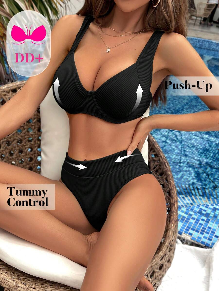 SHEIN Swim Summer Beach Rib Underwire High Waisted Bikini Set