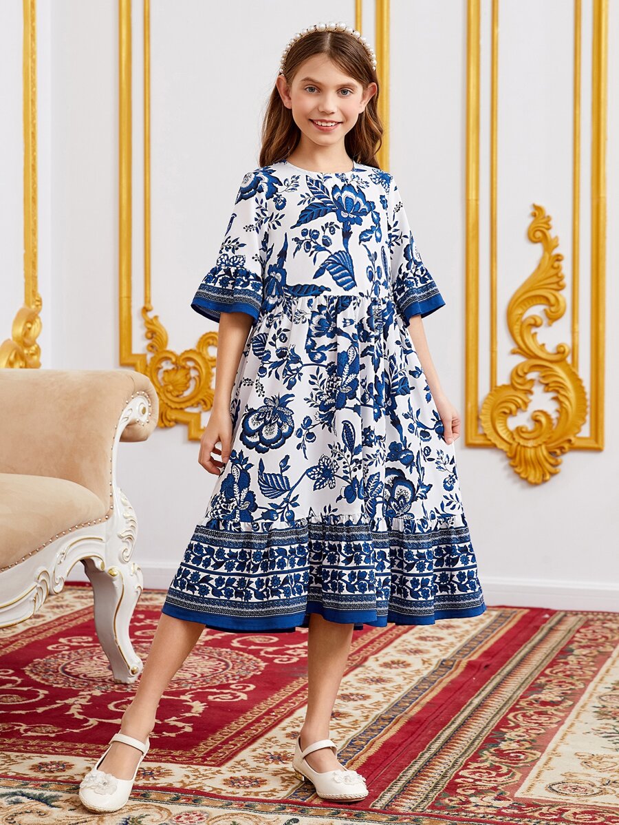 SHEIN Leap Crew Tween Girl Floral Print Flounce Sleeve Ruffle Hem Dress
