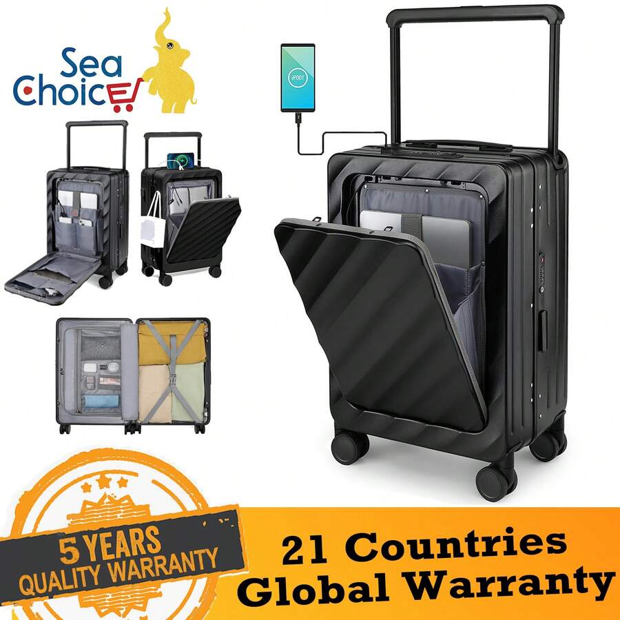 Sea Choice 55cm Carry On Luggage With Front Laptop Compartment Lock Pocket Hard Shell PC Aluminum Frame Closure Spinner Travel Trolley With YKK Zipper TSA Lock
