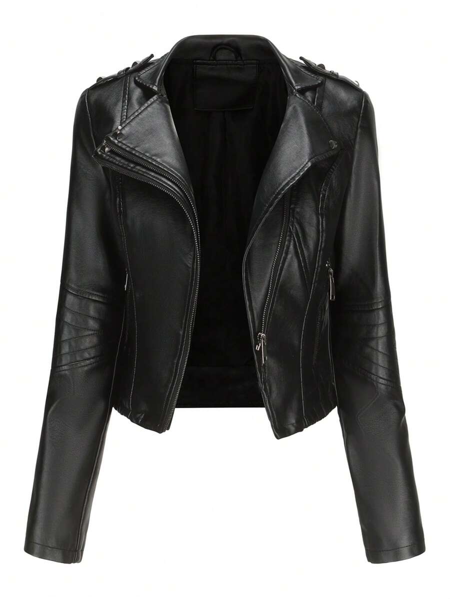 Women's Fashion Black PU Leather Motorcycle Jacket, Lapel Collar, Full Zip And Pockets, Short Length Long Sleeve, Suitable For Autumn And Spring