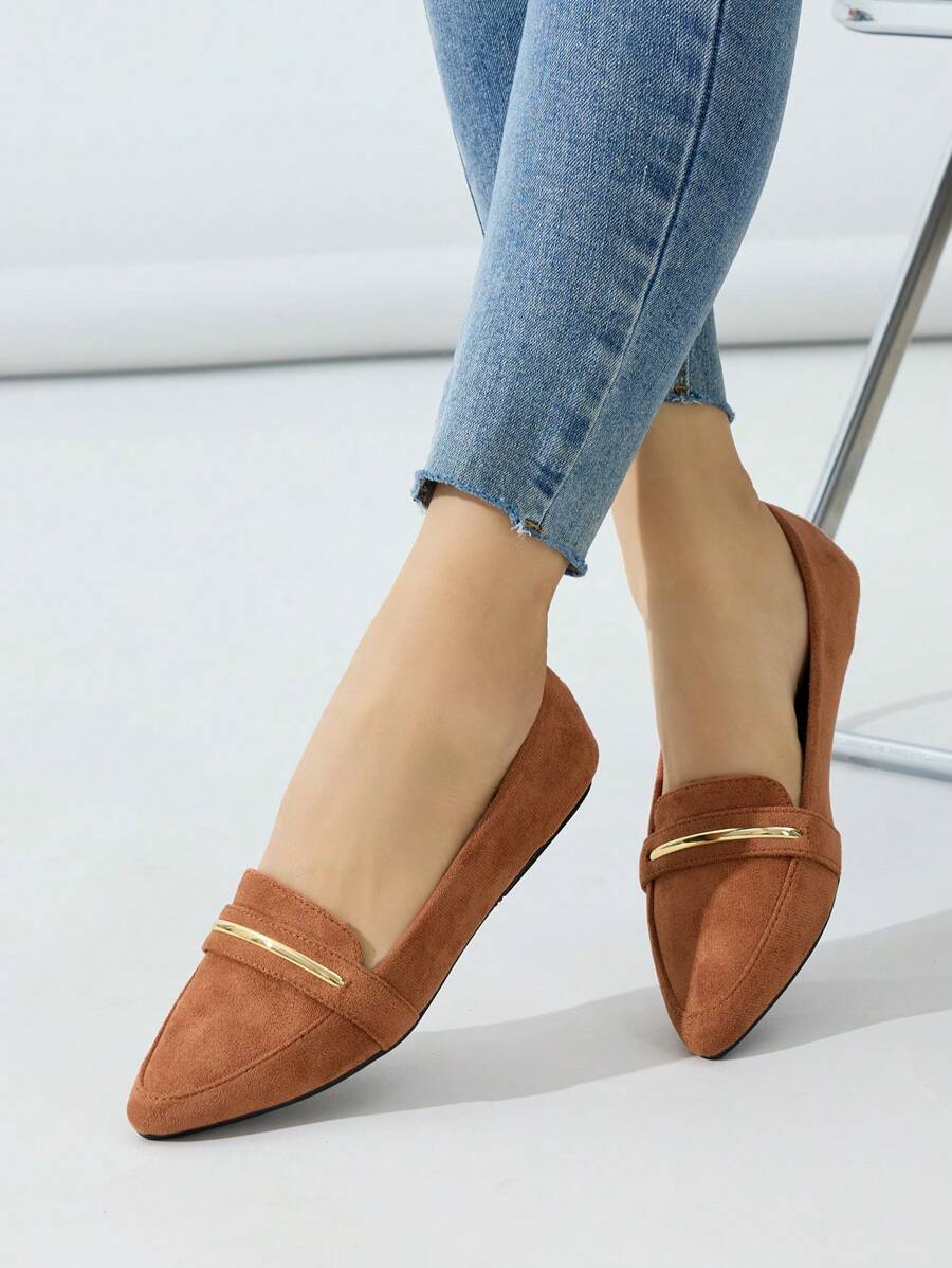 2025 Autumn Women's Pointed Toe Flat Metal Strap Ballet Flats, Comfortable Slip-On Loafers