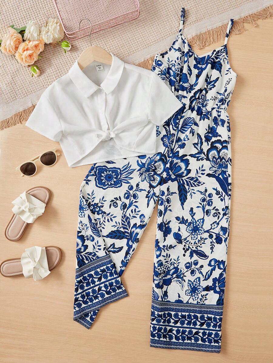 SHEIN Tween Girl Floral Print Cami Jumpsuit & Knot Front Shirt