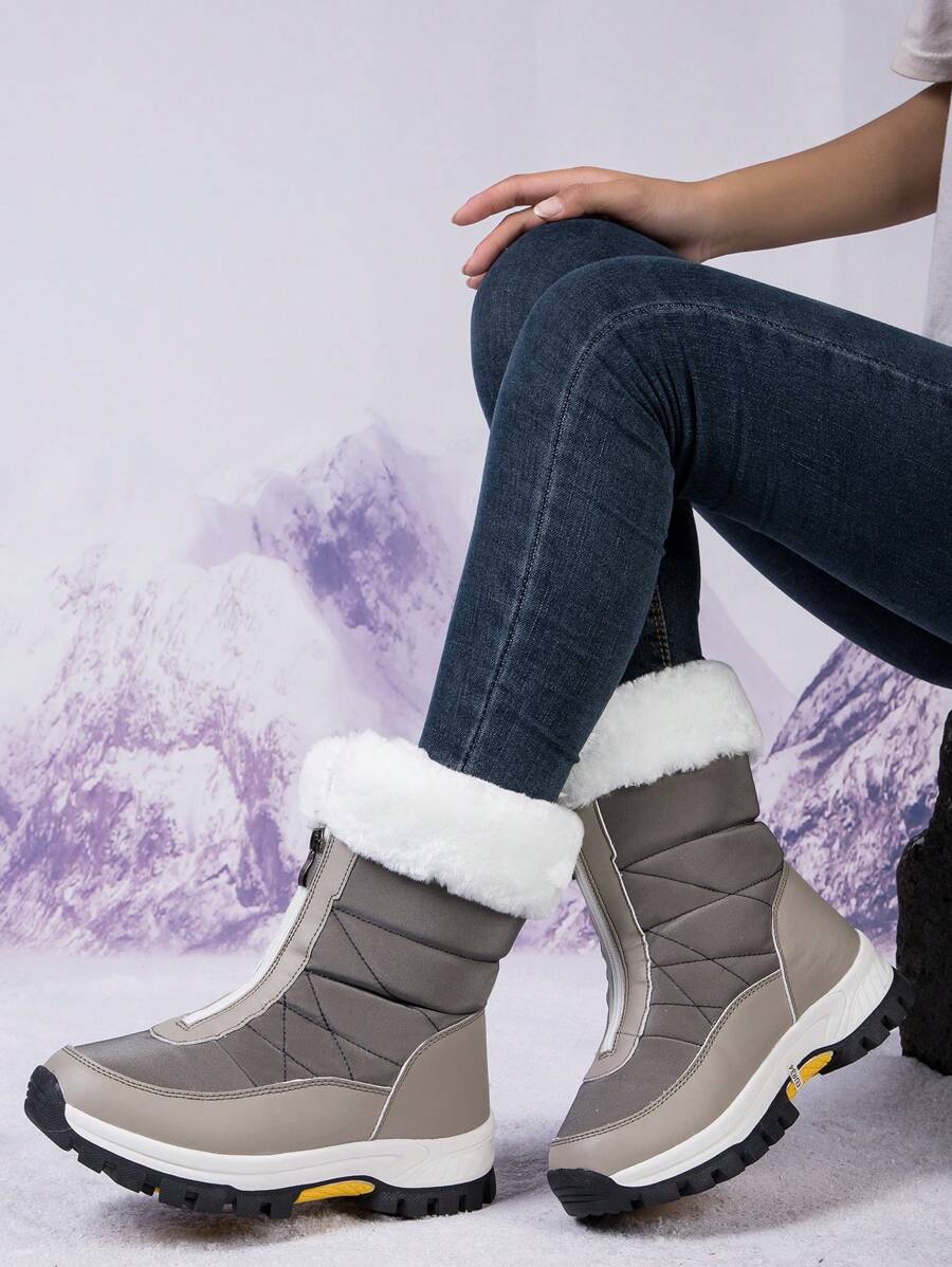 New Plus Size High-Top Anti-Slip Tall Snow Boots Women, Thermal Lined Warm Winter Outdoor Hiking Boots With Front Zipper, Gray Mid-Calf Boots For Winter Traveling (Winter Boots, Snow Boots)