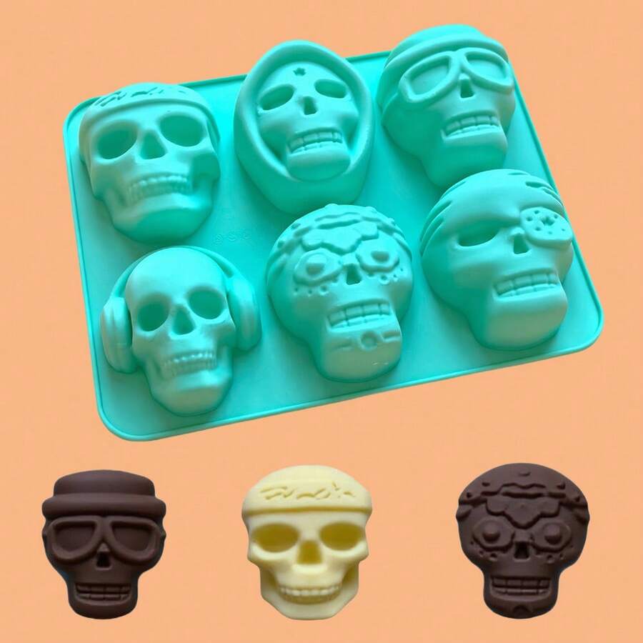 1pc Skull-Shaped Ice Cube Tray, 6 Cavity 3D Silicone Mold For Whiskey, Cocktail, Halloween Baking, Chocolate, Candy, Pudding, Reusable
