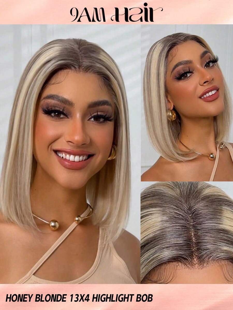Honey Blonde Highlights P18/613 Bob Wave 13X4 Lace Front Wig Human Hair Pre Plucked With Baby Hair High Density