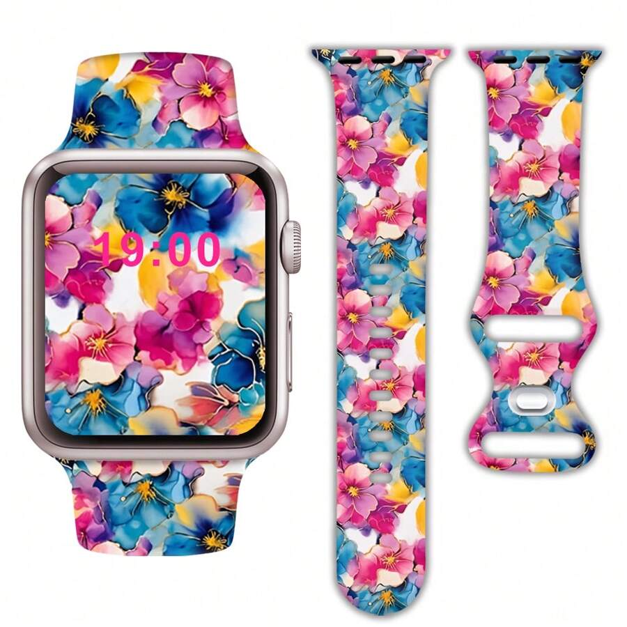 1pc Colorful Flower Silicone Strap Band Compatible With Apple Watch 38/40/ 41/42/44/45/46/ 49mm, Soft Silicone Replacement Sports Strap For Women Men, Compatible With Watch SE/10/9/8/7/6/5/4/3/2/1 Gift For Birthday Party Accessories Christmas Holiday