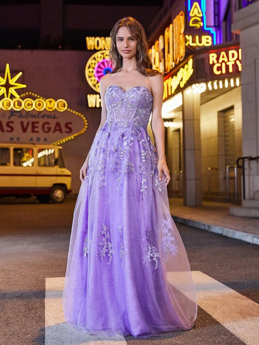 Women's Floral Embroidered Mesh Bandeau Evening Gown