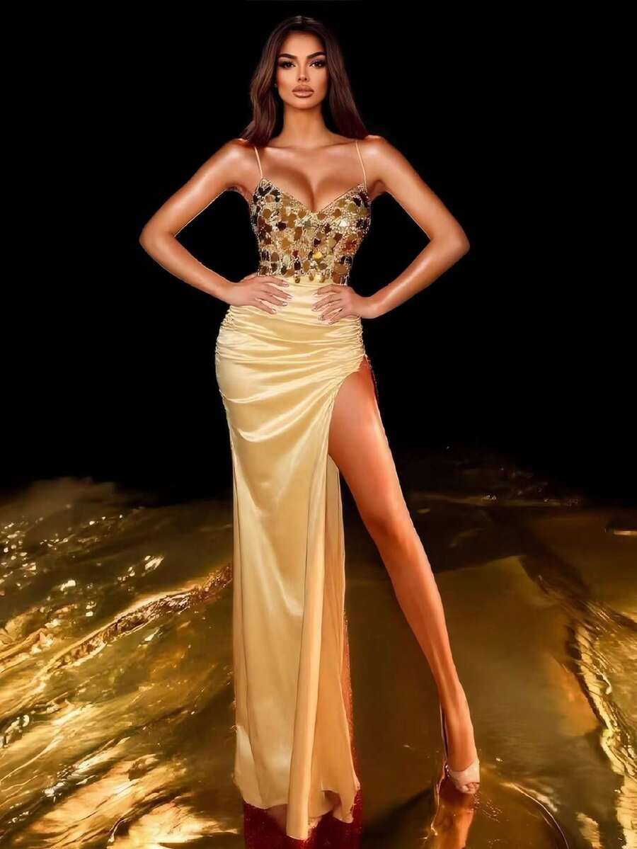 Women Glitter Patchwork Satin Party Dress With Padded Bust And Back Strap, Wedding Guest Dress, Formal Dress, Evening Dress,Gown