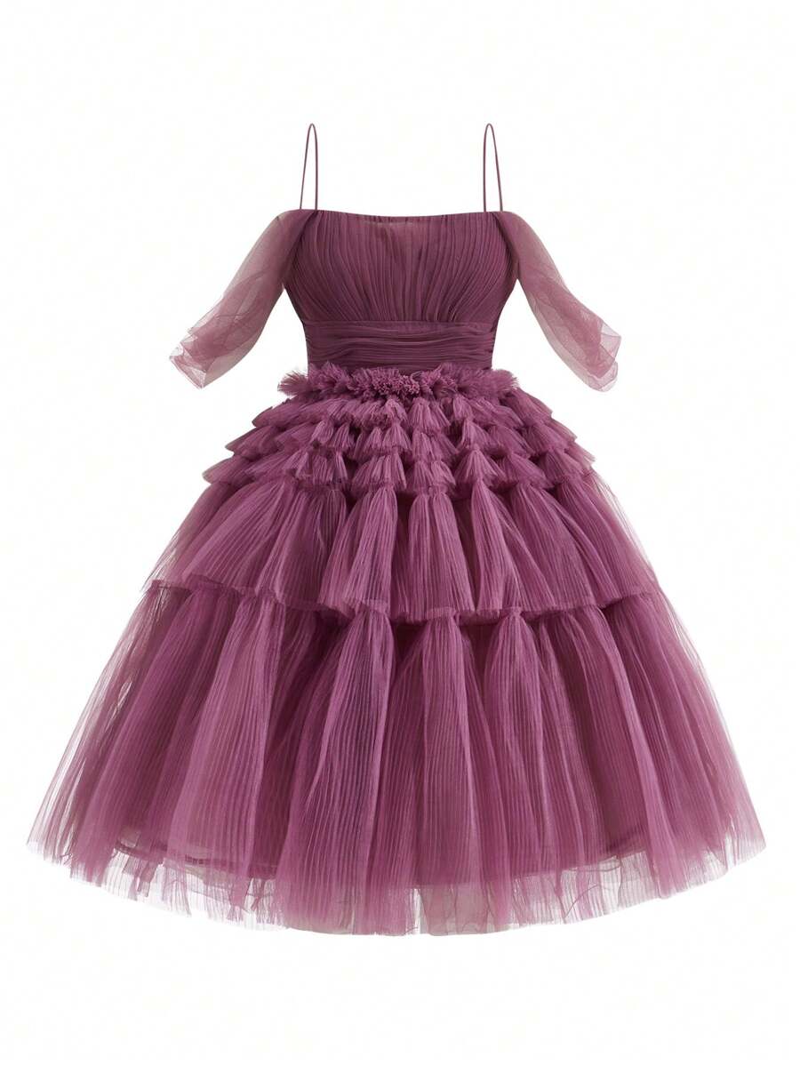 SHEIN Belle Women's Open Shoulder Layered Mesh Tulle Dress For Cocktail Party