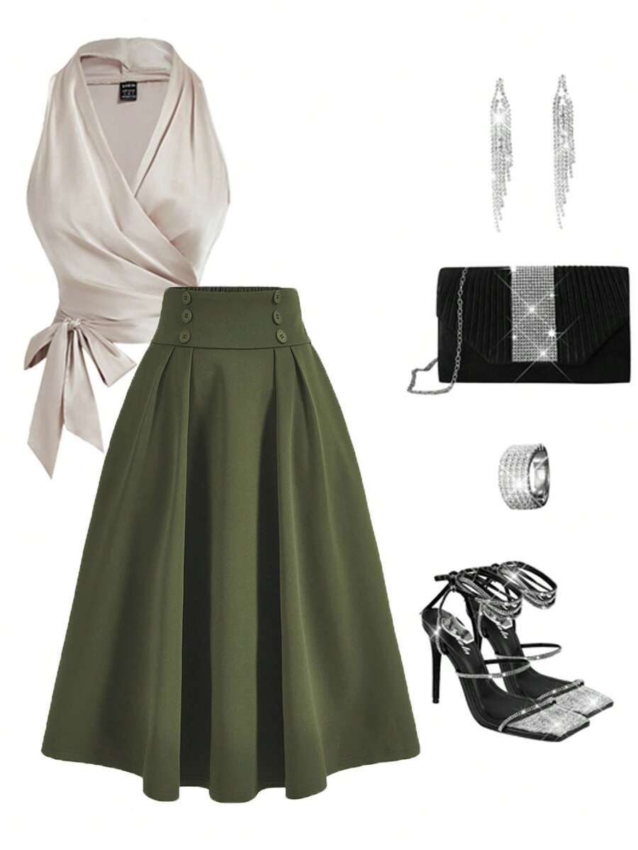 Ellevyn Women's Solid Color Pleated Button Detail Skirt