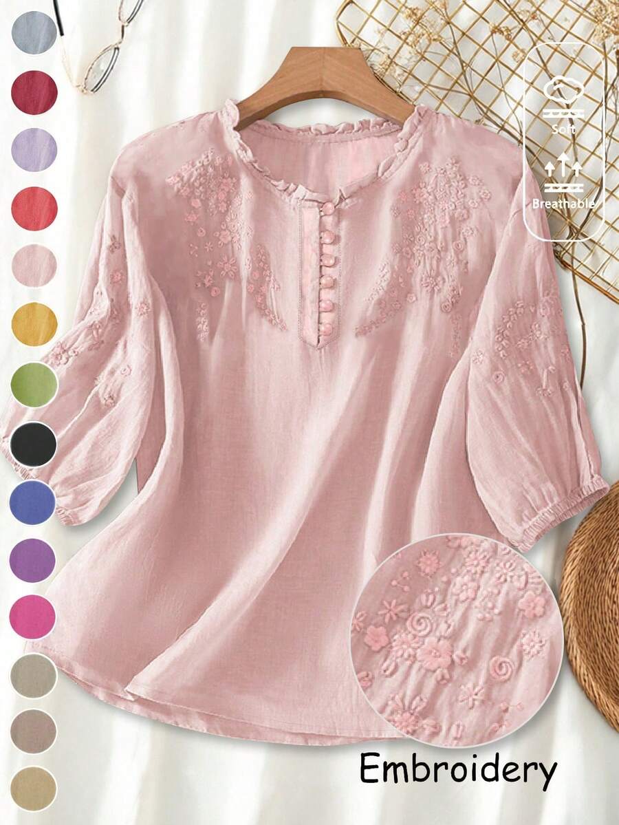 Women's Viscose Embroidered Light & Loose Vintage Style Mid-Sleeve Blouse, Spring Summer