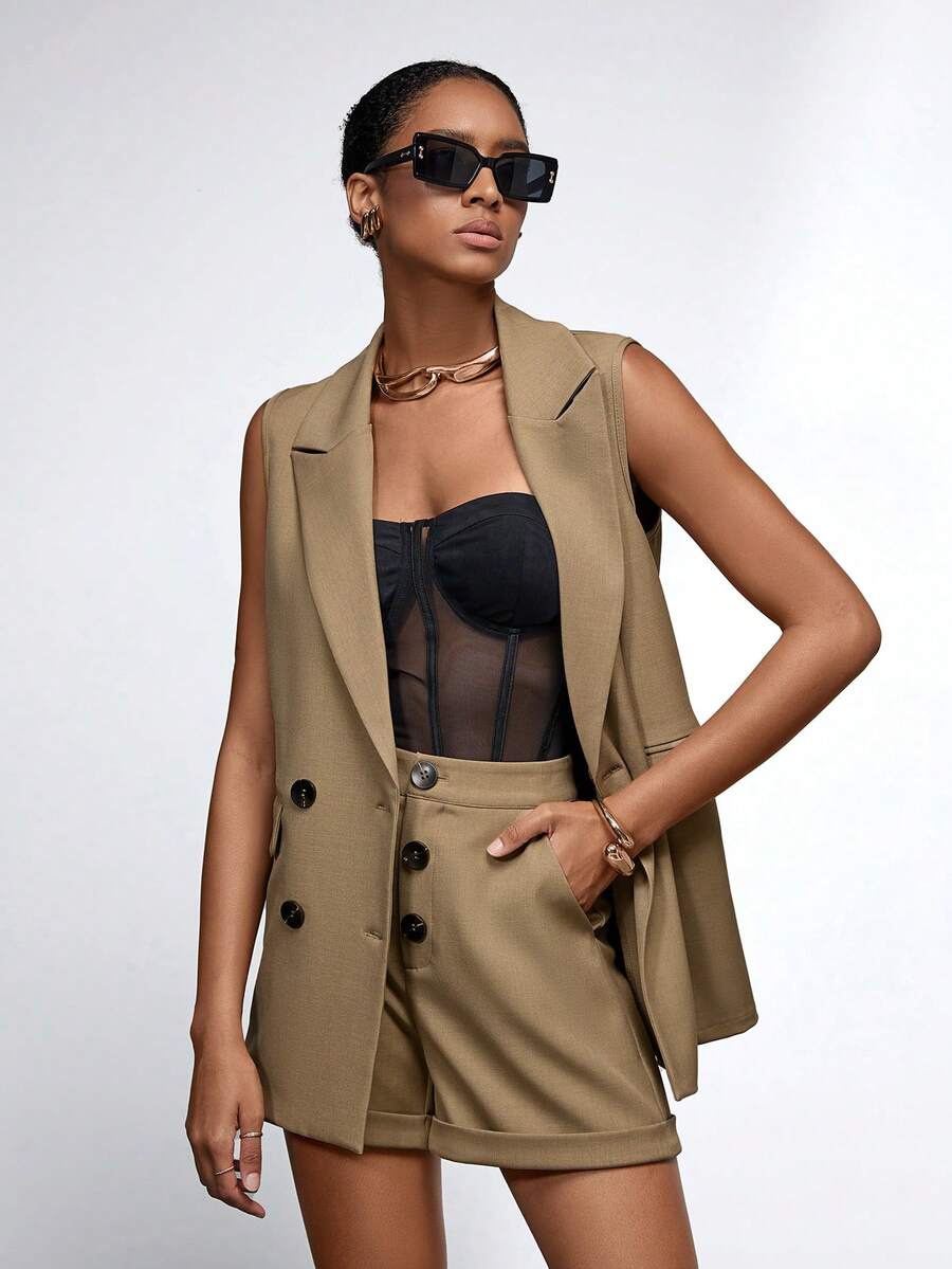 Women Fashionable Solid Color Sleeveless Blazer And Shorts Suit