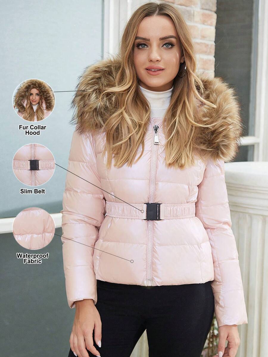 ZIAI Women's Casual Solid Shiny Winter Jacket, New Fashion Belted Slim Fit Thick Jacket, Women's Short Down Jacket With Faux Fur Collar, Fashionable Holiday Choice