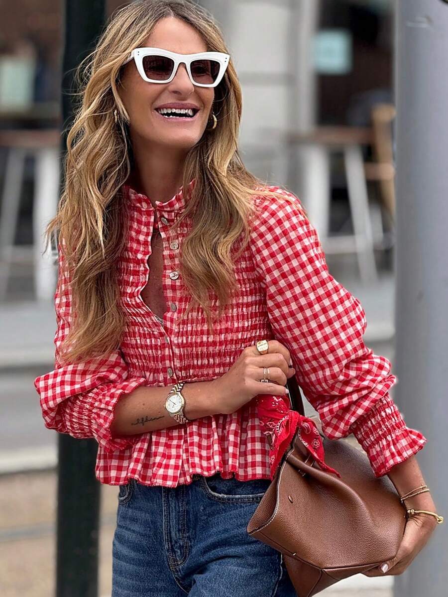 Women's Casual Vintage Street Style Ruffle Hem Plaid Shirt, Spring/Summer