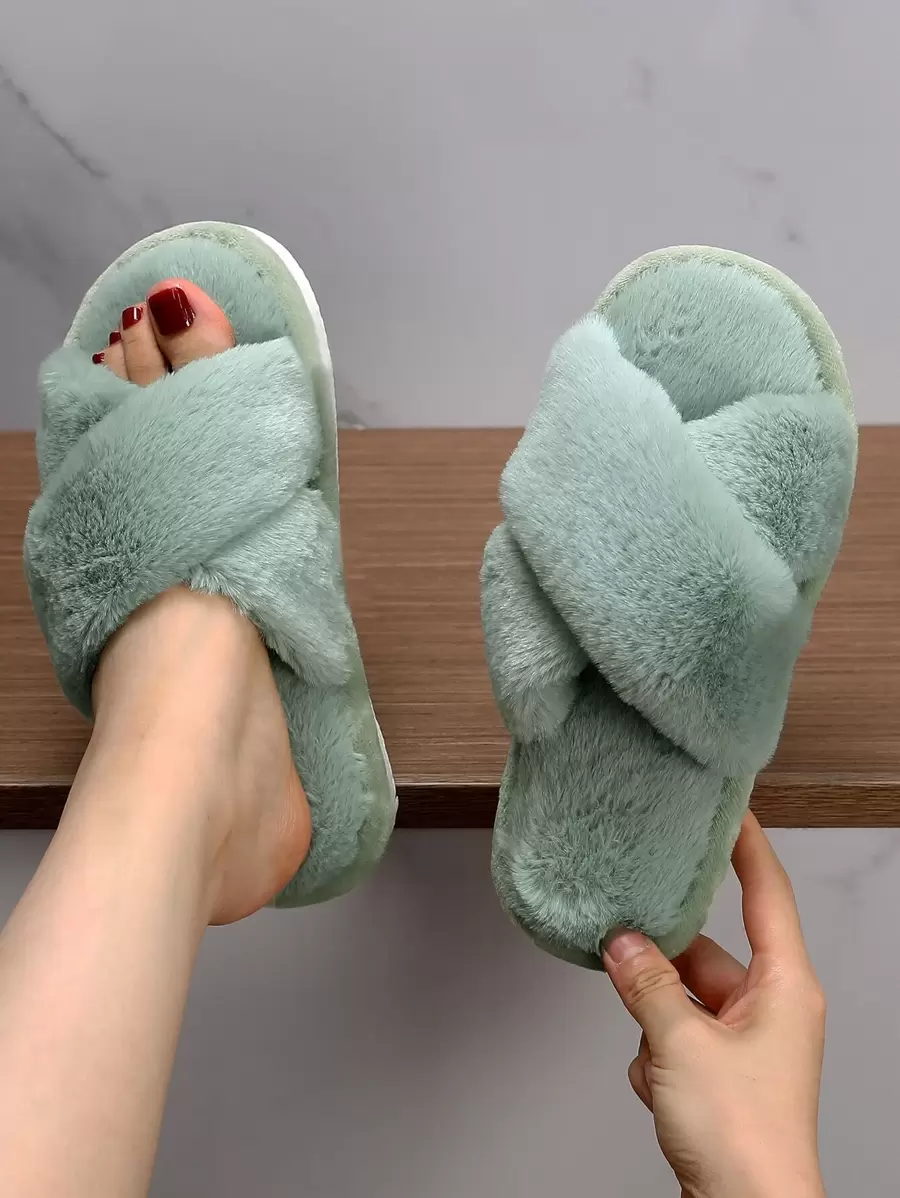 Fall/Winter Women's Fashionable Solid Color Slippers For Bedroom With Blurry Cross Design, Green,Furry Shoes,Fluffy Slippers
