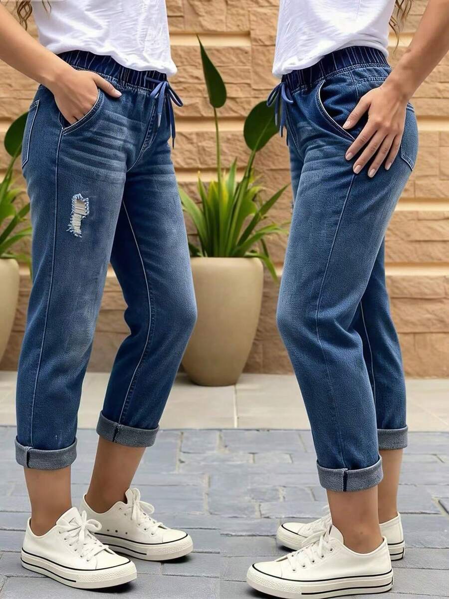 Women's Fashionable & Versatile Casual Comfortable Ripped Hem Drawstring Waist 9/10 Length Jeans
