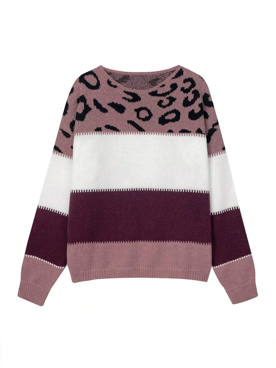 Women's Oversized Cute Colorblock Leopard Print Sweater, Casual Comfortable Ribbed Knit Crew Neck Pullover Long Sleeve Sweater Top, Anchor Red