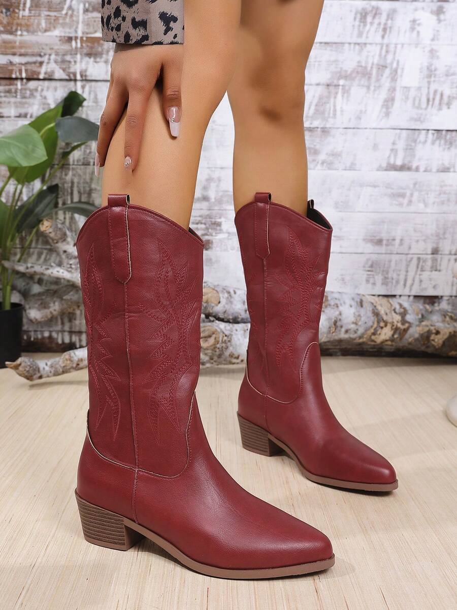 Women's Western Style Embroidered V-Cut Pointed Toe Block Heel Mid-Calf Boots