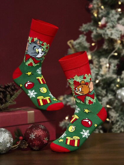 TOM & JERRY X SHEIN Soft & Breathable Moisture-Wicking Casual Mid-Calf Socks Gingerbread Man Pattern Fashionable Festival Green Crew Socks Reinforced Toe & Heel For Durability Unisex For Men & Women Winter,Gift Ideas