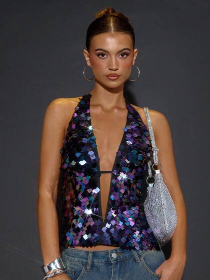 SHEIN BAE Women's Autumn/Winter Laser Colorful Sequin Sexy Backless Top, Suitable For Evening Gala, Carnival Party, Date Night, Nightclub Gathering, Y2K Sparkling Christmas Women, Christmas Party Women Top, Holiday Party Women Top, Thanksgiving/Sexy Women, Club Women