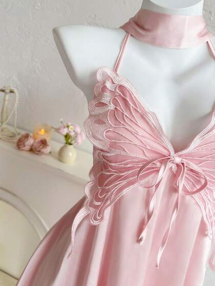 Sweetina Women's Butterfly Decor Halter Neck Sleeveless Mini Pink Dress 4th Of July Women Outfits