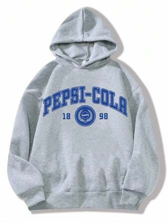 PEPSI X SHEIN Women's Gray Hooded Sweatshirt, Gray Sweatshirt, Text Print, Basic Casual, And Cool, Cola Pattern, Back To School, Tops For School, Basic Tops, Fall And Winter