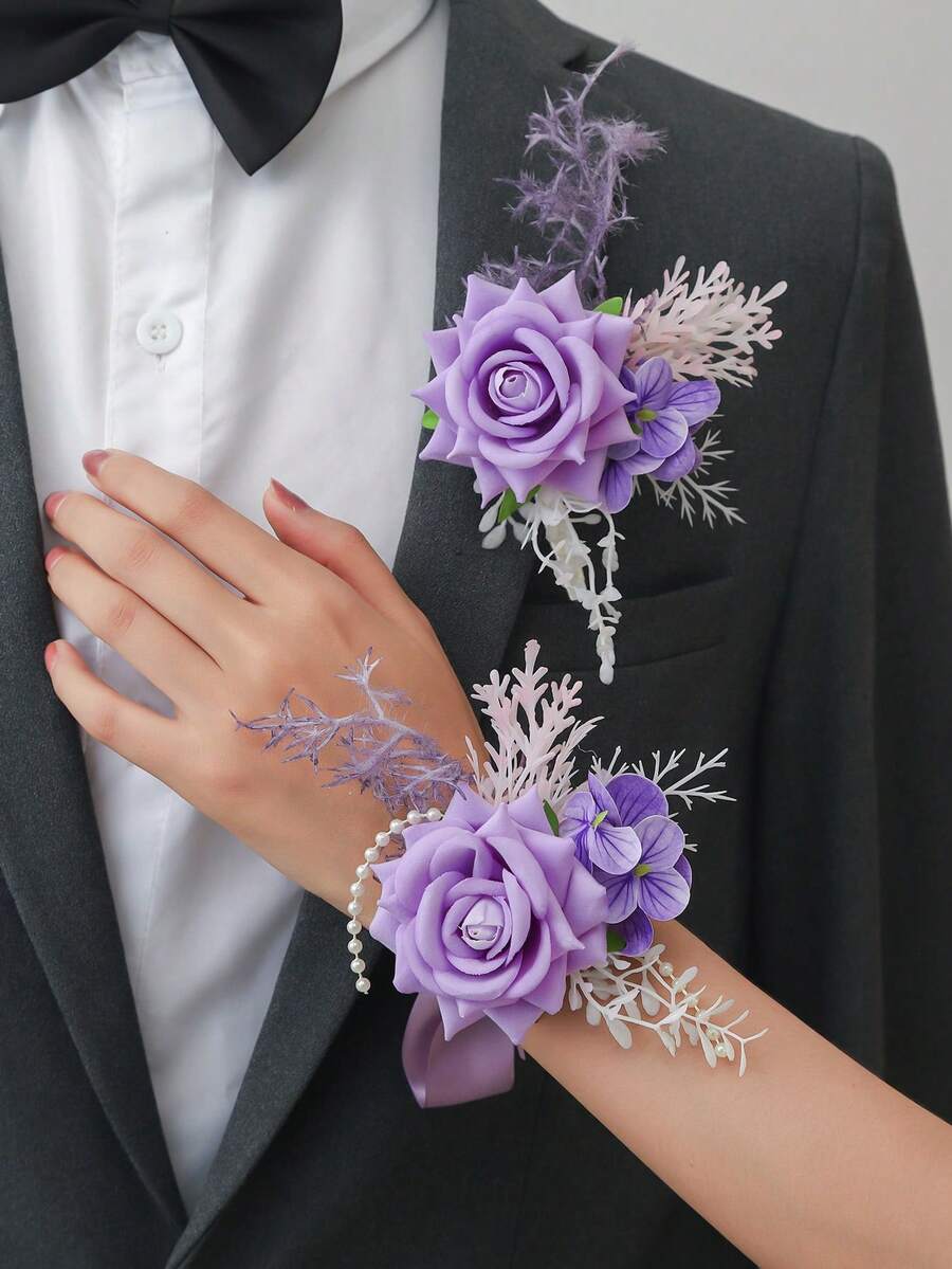 2pcs Elegant Purple Rose With Purple Hydrangea Faux Flower, Romantic Mori Style Boutonniere And Wrist Corsage, Suitable For Groom, Bride, Groomsmen, Bridesmaids, Parents, Wedding Decor, Engagement, Prom, Anniversary Valentine's Day Accessories