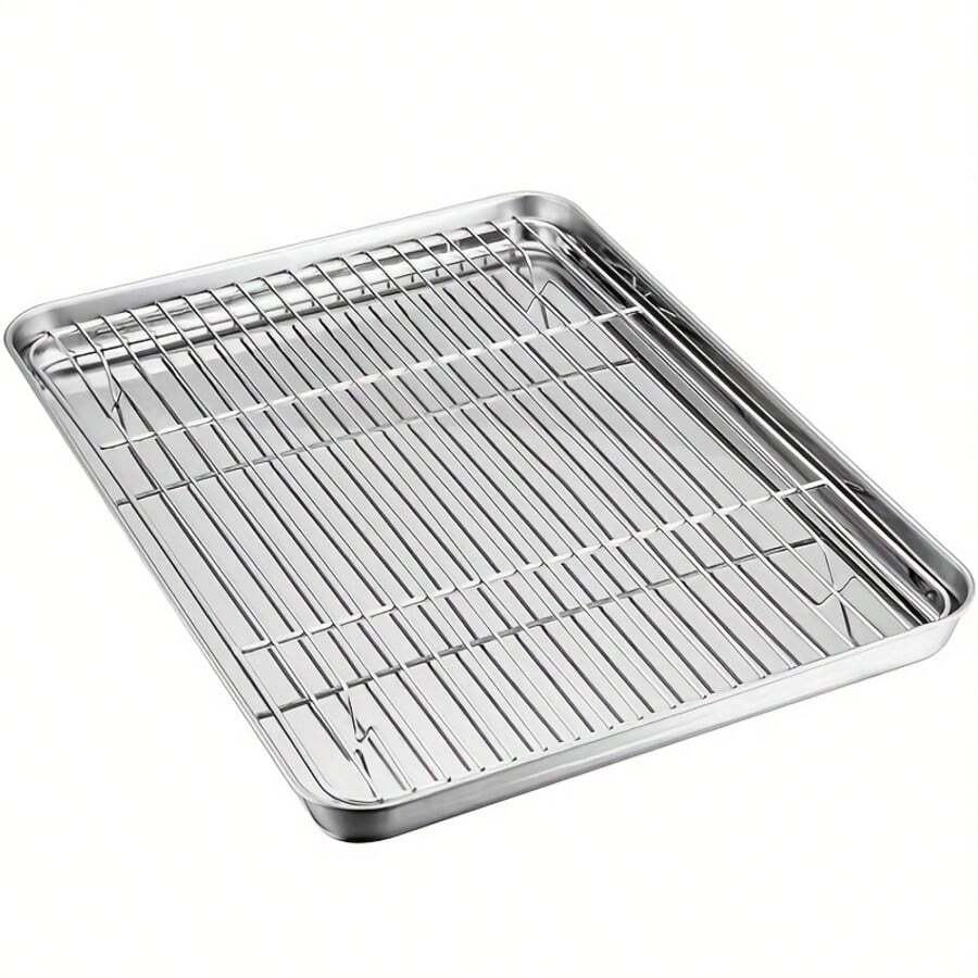2pcs Stainless Steel Baking Tray With Rack Set, Cookie Sheet, Thickened Edges, Heavy Duty, Anti-Rust, Easy To Clean, Oven Friendly, For Home Baking, Outdoor Picnics, Camping, Suitable As Christmas Gifts, Graduation Party Supplies
